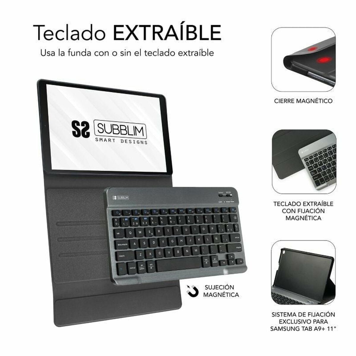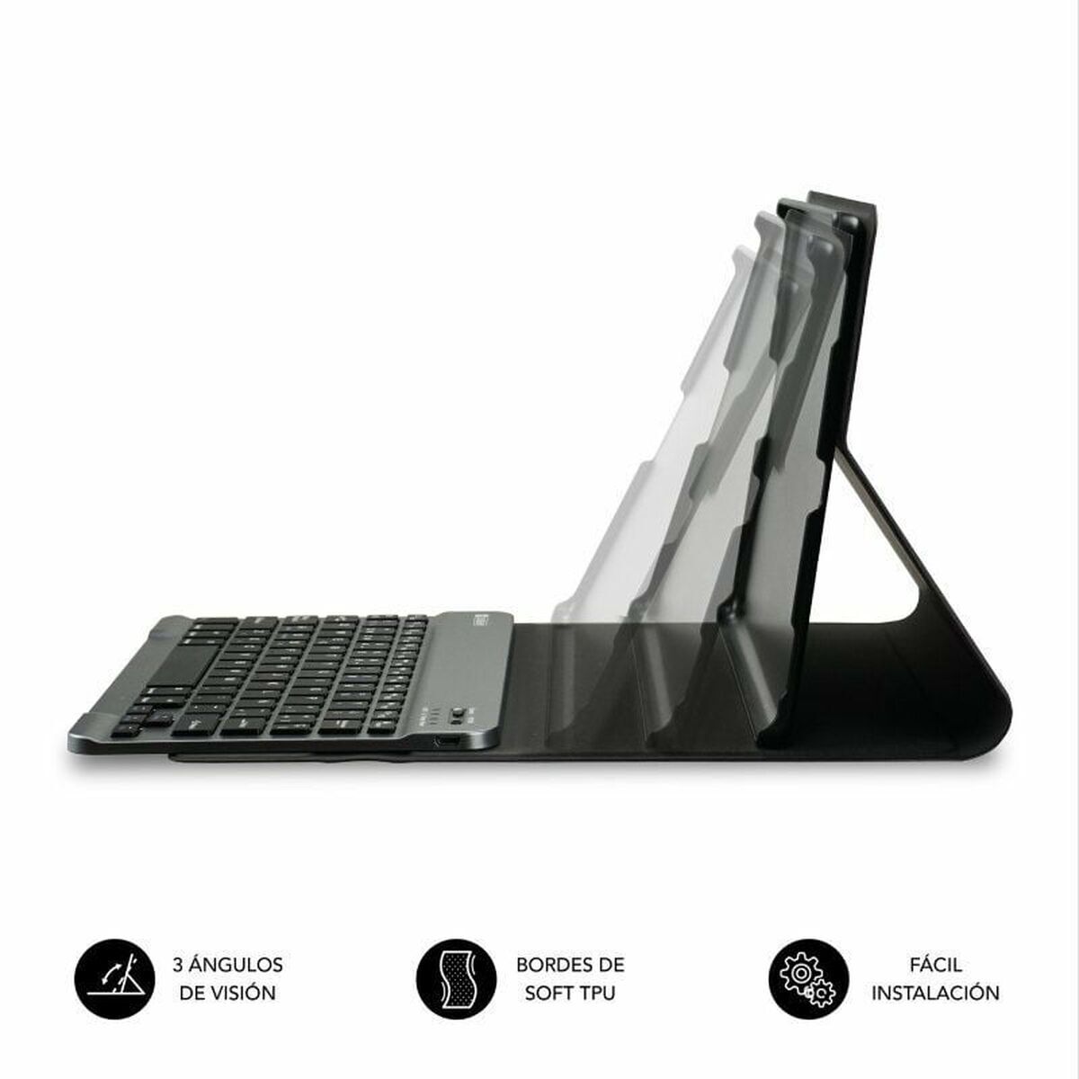 The tablet case Subblim SUBKT3-BTS060 is specifically designed to provide protection and functionality for devices up to 11 inches, offering full compatibility with the Samsung Galaxy Tab A9+ and other similarly sized Android and iOS tablets. Its elegant black color and high-quality materials ensure both a sophisticated look and optimal resistance to daily bumps and scratches. This model features a Bluetooth 5.2 wireless keyboard for a stable, efficient connection, allowing simultaneous pairing with up to three devices so you can easily switch between tablet, smartphone, or laptop. The keyboard is fully removable thanks to a system of strong magnets, offering versatility to attach or detach it as needed without hassle. The case provides precise access to all device functions, with well-placed openings for the camera, buttons, USB-C port, and headphones, ensuring maximum convenience in every use. Equipped with an auto wake and sleep system, the case activates or suspends the tablet when opened or closed, helping to optimize battery life. The magnetic flap closure keeps the case securely shut during transport, preventing accidental openings. Its ultra-slim and lightweight design adds extra value to portability, making it easy to handle and store in backpacks or briefcases without adding bulk. This integrated keyboard case is the ideal choice for those looking to protect their tablet while boosting productivity on the go or at work. In summary, the Subblim SUBKT3-BTS060 stands out as an advanced and stylish solution for users who prioritize both protection and functionality in a single accessory.
